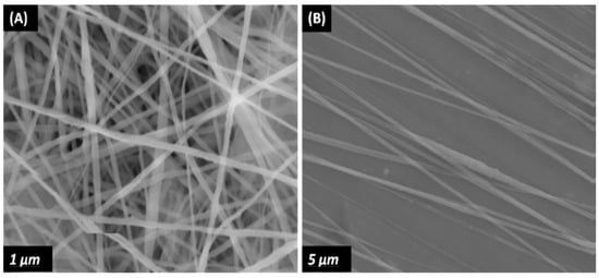 (A) Randomly oriented PVDF nanofibers deposited on a stationary metal plate covered with aluminum foil. (B) Aligned PVDF nanofibers deposited at the gap between two metallic bars of a collector.