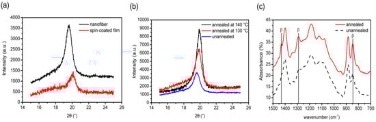 Jiang et al. prepared aligned P(VDF-TrEF) fibers (400–550 nm) with a rotating drum under a rotation speed of 2500 rpm followed by annealing at 130 °C and 140 °C [153]. Furthermore, spin-coated P(VDF-TrEF) film was also fabricated for the purpose of comparison. The XRD pattern of the as-spun fibers revealed the presence of a strong characteristic peak at about 20°, corresponding to the (110) and (200) planes of the β-phase. This characteristic peak became more intense in the spun fibers by annealing at 130 °C and 140 °C (Figure 16a,b). FTIR spectra also showed that the intensity of the bands due to the β-phase (846, 1285 and 1431 cm−1) of the annealed sample was stronger than that of the same bands of the unannealed specimen, especially at 846 and 1285 cm−1 (Figure 16c). Therefore, the β-phase content was further increased by the annealing treatment.