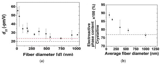 (a) Measured d33 as a function of fiber diameter from PFM. The red dashed line corresponds to the measured d33 of a 80 µm thick film, and the black dashed line is the d33 of bulk P(VDF-TrFE). Thick P(VDF-TrFE) film (80 µm) was made by drop-casting and employed as a reference. (b) Electroactive phase content determined by FTIR as a function of mean fiber diameter. The black dashed line represents the measured electroactive active content of a thick film prepared by drop-casting. Reproduced with permission from [152], published by Royal Society of Chemistry, 2016.
