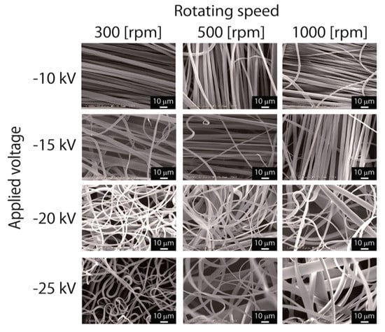 SEM images of PVDF fibrous mats prepared by melt-electrospinning at various applied voltages and collector rotating speeds. The laser output power and the polymer feed rate were fixed at 53 W and 1 mm min−1, respectively. Reproduced with permission from [160], published by Royal Society of Chemistry, 2017.