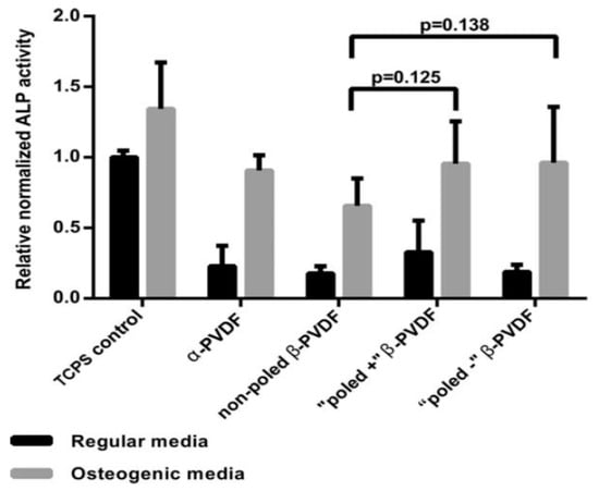 Relative alkaline phosphatase activity of hASCs on different PVDF films and tissue culture polystyrene (TCPS) control. The ALP activity was normalized against the DNA content of the cells. Reproduced with permission from [171], published by Wiley, 2015.