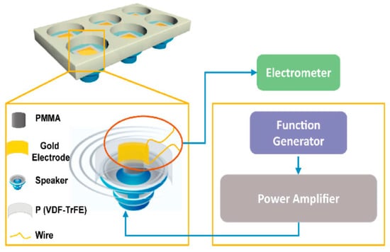 Wang et al. fabricated electrospun P(VDF-TrFE) mats with aligned fibers followed by annealing and electrical poling. The mean diameter of electrospun nanofibers was 590 nm ± 26 nm [175]. The β-phase content of the as-spun, annealed and poled P(VDF-TrFE) mats was 43.1%, 46.6% and 69.2%, respectively. They studied the effect of dynamic electrical stimulation on the adhesion and proliferation of mouse osteoblastic cells (MC3T3-E1) on annealed P(VDF-TrFE) and electrically poled P(VDF-TrFE) mats. Annealed P(VDF-TrFE) was designated as A-NFM, and P(VDF-TrFE) poled with the electric field of 80 MV/m and 100 MV/m were labeled as P80-NG and P100-NG, respectively. The set-up of flexible-bottomed culture plate was given in Figure 22. A speaker attached to the bottom of the cell culture plate would generate mechanical vibration at a frequency of 2 Hz for mimicking low-frequency biomechanics. The CCK-8 assay was used to examine the proliferation of MC3T3-E1 osteoblasts. Fluorescence microscopy images of MC3T3 osteoblasts on A-NFM, P80-and P100-NG revealed that the cells were elongated and oriented along the direction of nanofibers (Figure 23a). Moreover, P100-NG and P80-NG exhibited a higher cell proliferation rate than A-NFM. So poled fibrous mats with piezoelectricity increased osteoblastic cell proliferation considerably (Figure 23b).