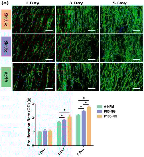 (a) Fluorescence micrographs of MC3T3 cells cultured on fibrous A-NFM, P80-NG, and P100-NG mats for 1, 3, and 5 days. The scale bar is 100 µm. (b) Proliferation of MC3T3 cells on P80-NG, P100-NG, and A-NFM mats. All data represent the mean standard deviation (n = 3, * p < 0.05).