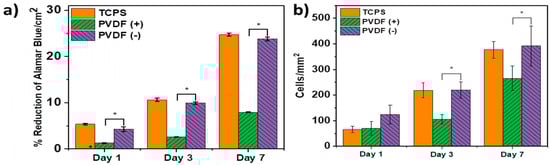 Lanceros-Méndez and coworkers carried out a series of studies on the interactions between the PVDF and cells [13,48,105,112,168,169]. In those studies, solvent-cast dense films, solvent-cast particulate-leaching films, and NIPS porous membranes were fabricated. Particular attention was paid to the effect of the surface charge of PVDF induced by electrical poling on the fibronectin adsorption, osteoblastic cell attachment and proliferation [13,168]. Solvent-cast PVDF films (α-PVDF) were mechanically drawn to induce β-PVDF. The β-PVDF films were further poled by corona discharge to induce negative and positive electrical surface charge on the cell culture side, respectively [168]. The results showed that electrical poling decreased the water contact angle of β-PVDF films. The dipoles of β-PVDF would interact with water molecules, thereby enhancing their wettability. The positively and negatively poled β-PVDF films exhibited a water contact angle of 31.8° and 51.1°, respectively, thus showing hydrophilic behavior. Therefore, poled β-PVDF films favored fibronectin protein adsorption, thereby facilitating MC3T3-E1 osteoblastic cell adhesion and proliferation. It is generally known that the surface hydrophilicity and topography modulate protein adhesion, thereby affecting cellular response accordingly [170]. Apparently, the combination of surface wettability and piezoelectricity was effective for promoting osteoblastic cell attachment and proliferation. In another study, it was also found that the differentiation of human adipose-derived stem cells (hASCs) into osteogenic lineage was affected by substrate polarization of β-PVDF. Negatively poled β-PVDF promoted higher osteogenic differentiation, as evidenced by higher ALP activity (Figure 21) [13,171].