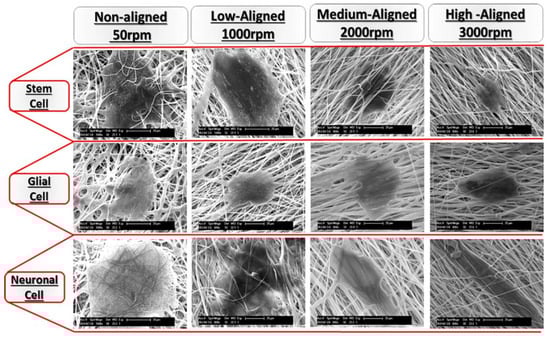 Compared to conventional processed scaffolds, electrospun nanofibrous mats with a large surface to volume ratio are attractive for tissue engineering applications because they mimic the fibrillar structure of natural ECM secreted by the cells (Figure 9) [116]. Fibers from nano- to micrometer scale can be prepared by electrospinning. The fabrication process involves the application of a high electric field to the polymer/solvent solution. Above a critical voltage, electrostatic repulsion overcomes the surface tension of polymer droplet developed at a needle tip attached to the syringe pump. Therefore, a charged polymer jet is ejected from the needle tip towards a grounded collector, leading to the formation of random or aligned fibers. The electrically charged jet experiences bending instability and whipping motion resulting in a randomly oriented fiber deposition on the collector. Moreover, the jet also undergoes stretching due to electric field and solvent evaporation, thus causing jet thinning. The fiber diameter and porosity of the fibrous scaffolds depend on the processing parameters such as applied voltage, solution flow rate, type of solvent, polymer concentration in the solution, solution conductivity, and the distance between the needle and collector [117,118,119]. Because of the chaotic trajectory of the polymer jet, the fibers collected on a grounded collector generally exhibit random orientation, so depositing as a non-woven scaffold. Electrospun fibers can be aligned by controlling the rotation speed of the mandrel, magnetic field or electric field at the gap between a pair of electrodes (Figure 10) [118,120,121].