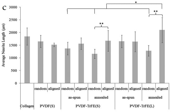 - Koppes, A.N.; Zaccor, N.W.; Rivet, C.J.; Williams, L.A.; Piselli, J.M.; Gilbert, R.J.; Thompsom, D.M. Neurite outgrowth on electrospun PLLA fibers is enhanced by exogenous electrical stimulation. J. Neural Eng. 2014, 11, 046002. [Google Scholar] [CrossRef]