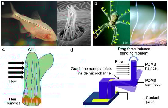Ultrasensitive hair-like ‘cilia’ structures are ubiquitous in nature and perform flow sensing in numerous animal species, examples of which are shown in Figure 1a (blind cavefish or Astyanax mexicanus fasciatus) and Figure 1b (tiger wandering spider or Cupiennius salei). The sensing principle of the cilia in all these species is similar, namely, that the drag force induced by the flow is translated to mechanical bending of the high-aspect ratio cilia, which in turn elicits an electrical impulse across the hair cell membrane located at the base of the cilia (Figure 1c). Cilia sensors in crickets are capable of detecting airflow velocities as low as 0.05 mm/s [10], while the neuromast cilia sensors in fishes can detect steady-state water flow velocities down to 10 mm/s [11] and oscillatory flow velocities as low as 10–38 µm/s in the 10–20 Hz range [12,13]. The hair-like sensilla on spider legs are sensitive to air flow perturbation energies as low as 2.5 × 10−20 Joules [14]. Mechanosensitive ‘stereocilia’ bundles achieve ultrafast and sub-Brownian threshold detection of sound, linear acceleration, and angular velocity by exhibiting microsecond response times and nanometer-scale deflection sensitivities in the inner ear of mammals [15]. Similar to the cilia, seals use their whiskers as ultrasensitive flow sensors to detect wake trails generated by fishes, allowing them to hunt prey swimming 180 meters away [16]. The dimensions of most biological cilia range from 2–1500 µm in height and 0.2–500 µm in diameter, thus allowing cilia-inspired sensors to be fabricated using MEMS technology [17]. Researchers have achieved impressive sensitivity (as high as 0.077 V/m s−1) and threshold velocity detection limits (as low as 0.015 m s−1) by closely mimicking, for instance, the anatomy and functionality of lateral line sensors found in fishes [18,19].