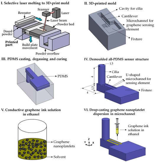 Schematic of fabrication process flow involving metal 3D printing (selective laser melting), PDMS casting, and graphene infusion into microchannel. Selective laser melting (SLM) process schematic (Image I) reprinted with permission from [54], Copyright Elsevier, 2019. All dimensions in Image IV are in mm. The size of the graphene nanoplatelets in Image V is exaggerated.