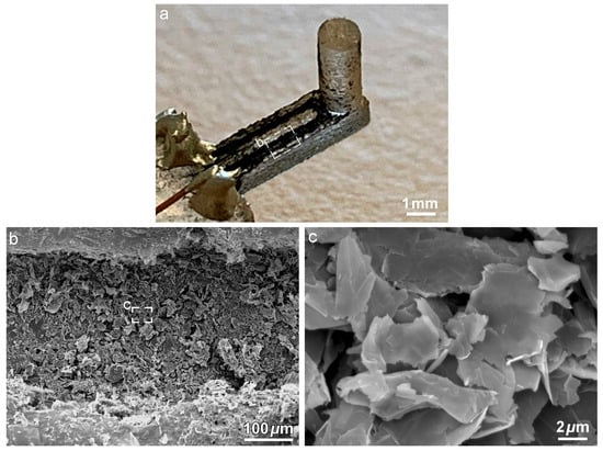 Micrographs of sensor structure with graphene infused into the microchannel: (a) optical micrograph of the developed sensor, (b) SEM image of GN inside the microchannel and (c) high magnification SEM image showing the morphology of GN sensing elements.