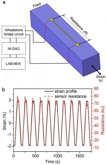 Gauge factor measurement: (a) schematic of tensile test setup to measure resistance for an applied strain (blue: PDMS, yellow: graphene); and (b) applied strain profile and measured resistance change for 10 tension-compression cycles.