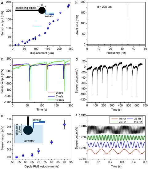 In the RMS driving voltage sweep, the FFT of the voltage-time data provided the sensor output at the 35 Hz driving frequency, allowing the sensor output variation as a function of the oscillatory velocity of the dipole. In the frequency sweep, the FFT operation was used to isolate the sinusoidal sensor output at the driving frequency to determine whether the sensor was capable of responding to different frequencies. Figure 5e shows the flow calibration of the sensor for oscillatory flow stimulus in DI water. The sensor demonstrated a sensitivity of 30 mV/(m s−1) in the velocity range of 65–90 mm/s which was in the range of reported sensitivities (0.6–44 mV/m s−1) for recently reported cilia-inspired flow sensors tested under similar conditions [24,57]. For the RMS velocity sweep at a constant frequency of 35 Hz (Figure 5e), the sensor could not detect the lowest tested RMS velocity of 53 mm/s, thus giving a sensing threshold of 58 mm/s for the RMS velocity of the vibrating sphere. Figure 5f shows the post-FFT sensor response for varying frequency excitations of the dipole at 10 Hz, 35 Hz, 75 Hz, and 110 Hz. The results proved the sensor’s ability to respond to near-field perturbations in water, and can be used, for instance, in the underwater detection of objects especially in murky conditions with low visibility.
