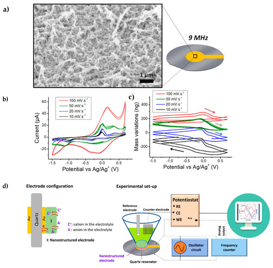 (a) SEM micrograph of PEDOT NWs on the surface of a 9 MHz quartz crystal microbalance (QCM); (b) cyclic voltammetry (CV) measurements on PEDOT NWs in ACN + 0.5M TBABF4 at various scan rates, (c) the corresponding mass variations obtained with QCM coupling to CV (two cycles) and (d) schematic presentation of the quartz configuration and experimental set-up used for electrochemical quartz crystal microbalance (EQCM).