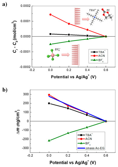 The resulting concentration variations, depicted in Figure 3a, show that TBA+ cations were exchanged but in smaller quantities than BF4−. ACN contribution was quite significant compared with the ionic species in terms of concentration. As already explained, the solvent molecules were exchanged in the same flux direction with the TBA+ but in opposite flux direction with the BF4−. Since the solvent transfer occurs at low frequencies after the transfer of anions, the exclusion of the solvent molecules with the insertion of anions could be assumed, in agreement with previous reports in the literature, (i.e., considering VClO4− = 47Å3 and VCH3CN = 37Å3, one ClO4− can replace approximately one acetonitrile molecule as a result of an exclusion effect [51]).