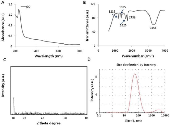 Graphene oxide materials were synthesized as described in our recent study [16], and then characterized using various analytical techniques, including ultraviolet-visible (UV-vis) spectroscopy (Biowave II spectrophotometer, Biochrom, Cambridge, UK). Fourier transform infrared (FTIR) spectroscopy (Perkin Elmer Inc., Waltham, MA, USA), X-ray diffraction (Bruker AXS GmbH, Karlsruhe, Germany), dynamic light scattering (Malvern Instruments, Malvern, UK), scanning electron microscopy (Tokyo, Japan), transmission electron microscopy (Tokyo, Japan), and Raman spectroscopy (Lise-Meitner-Str. Ulm, Germany). First, UV-vis spectroscopy was performed on the aqueous graphene oxide dispersions (Figure 1A). Graphene oxide displayed two different characteristic features: A shoulder at approximately 300 nm, corresponding to an n-π* plasmon peak, and a separate shoulder at 230 nm, corresponding to a π-π* plasmon peak [32].