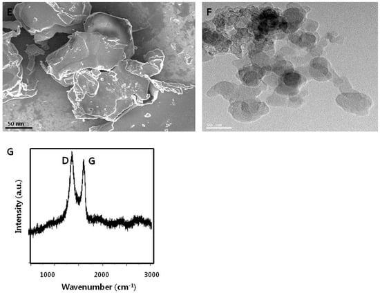 Raman spectroscopy is used to observe the atomic vibrational, rotational, and other low-frequency dynamic modes in carbon materials. It is a very well designed technique to identify the molecular or atomic composition of samples quickly and reliably. As depicted in Figure 1F, Raman spectroscopy revealed a prominent Raman signal shift of the D band at approximately 1350 cm−1, which can be attributed to sp3-dependent defects on the breathing modes of the sp2 rings. These defects indicate flaws in the graphene structure and the G band at approximately 1600 cm−1, owing to the vibration of the sp2-bonded carbon atoms were observed in graphene oxide with the ID/IG value of 1.0. The D and G bands were attributed to disorders in the C–C bonds and in-plane vibrations of the C–C bonds, respectively, which is in agreement with previous reports [28,36,37,38].
