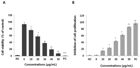Independent experiments were repeated at least three times with three replicates for each concentration. Data were analyzed by a Student’s t-test to determine the one sample to control and significant differences denoted by an asterisk. The results are presented as mean ± standard deviation of three experiments. *p < 0.05 was considered significant, **p < 0.01 was considered highly significant, and ***p < 0.001 was considered very highly significant.
