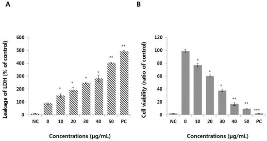 Graphene oxide induces cytotoxicity by increasing LDH leakage in a variety of cancer cells, including ovarian cancer, neuroblastoma, and human lung cancer cells [17,28,31]. Cho et al. [40] reported that the LDH level in SLGO-treated groups was higher than in MLGO-treated groups. The LDH level peaked at >40 μg/mL of SLGO and MLGO following a dose-dependent increase. In support of this mechanism of toxicity, Ding et al. [41] observed that GO-PEI (polyethyleneimine) -treated T lymphocytes exhibited compromised cell membranes due to the interaction between GO-PEIs and the cell membrane that eventually resulted in significant cytotoxicity. Recently, Zhu et al. [22] reported that graphene oxide, even at sub-lethal concentrations, can impair the general cellular priming state, including disrupting the plasma membrane and cytoskeleton construction, and inhibited several biological processes (e.g., morphological impairment) in J774A.1 macrophages and A549 lung cancer cells. These impairments of the plasma membrane eventually disrupt the cellular equilibrium of ions, proteins, and drugs, leading to cell injury, or even death [42]. Our results suggest that LDH leakage is dose-dependent and impairs the equilibrium state of the cells. Collectively, these findings suggest that the mechanism of membrane impairment and subsequent cytotoxicity is due to the physical interaction between cells and the nanomaterials [22,29,33,42,43].