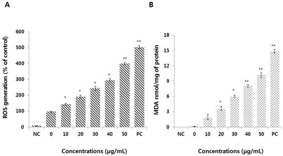 Graphene oxide-treated HEK293 cells showed a high rate of ROS formation with increasing doses of graphene oxide (10–50 μg/mL). ROS combine with hydrogen atoms, generating water and a fatty acid radical that can cause oxidative degradation of lipids and, subsequently, cell membrane damage [43,44]. We examined the concentration-dependent production of malondialdehyde (MDA) in response to graphene oxide treatment. As shown in Figure 4B, graphene oxide induced lipid peroxidation (LPO) dose-dependently. Srikanth et al. [45] also demonstrated a dose-dependent increase in LPO in BF-2 cells with increasing concentrations of graphene oxide. Thus, our results are consistent with previous studies showing increased levels of ROS, MDA, and LPO in a variety of cells type, including human dental follicle, neuroblastoma, and human ovarian cancer cells, in response to graphene oxide treatment [46,47,48].