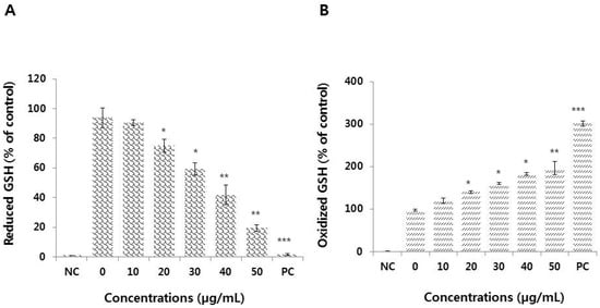 Since thiol metabolism seems to play an important role in defense against exposure to toxicants such as nanoparticles, the concentration of reduced glutathione (GSH) was determined in HEK293 cells after incubation with graphene oxide. The level of GSH was significantly and dose-dependently decreased in graphene oxide-treated cells (Figure 5A).
