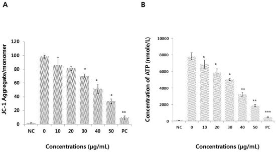 Measurement of MMP and ATP in HEK293 cells. (A) HEK293 cells were treated with various concentrations of graphene oxide for 24 h. Changes in MMP were then determined using a cationic fluorescent dye, JC-1. (B) ATP levels were measured according to the manufacturer’s instructions (Sigma-Aldrich; Catalog Number MAK135) in HEK293 cells exposed to graphene oxide for 24 h. The results are expressed as the means ± standard deviation of three independent experiments. There were significant differences in the ratios of MMP and ATP production in graphene oxide-treated cells compared to untreated cells. *p < 0.05 was considered significant; **p < 0.01 was considered highly significant and ***p < 0.001 was considered very highly significant.