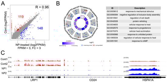 Graphene oxide alters gene expression patterns. (A) Scatterplot showing differentially expressed genes (DEGs) in RGO-exposed HEK293 cells. Red and blue dots represent genes respectively down- and upregulated in the experimental group. Log2FPKM values were used for plotting. Cutoff values: FPKM > 3 and fold change (FC) > 3. (B) GO term analysis of the DEGs. (C) IGV browser images of representative down- (LRP1 and CD24) and upregulated (HSPA1A) genes.