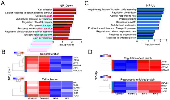 Analysis of gene ontology for the down- or upregulated genes. (A) Bar graphs displaying the top 10 GO terms in the genes repressed by graphene oxide. The x-axis scale represents -log10(p-values) values. (B) Heatmaps showing the expression of genes in the GO terms of cell proliferation and cell adhesion. NP, nanoparticle. (C) Bar graphs displaying the top 10 GO terms in the genes enhanced by graphene oxide. (D) Heatmaps showing the expression of genes in the GO terms of regulation of cell death and response to unfolded protein.