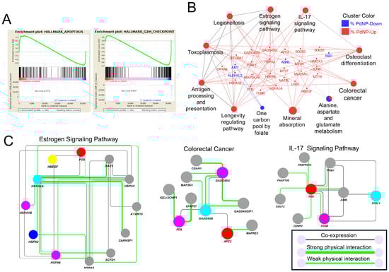 Apoptosis-related pathways were significantly altered by graphene oxide. (A) Gene set enrichment analysis (GSEA) showing enriched pathways in the DEGs. Note that genes in the apoptosis and G2/M checkpoint pathways were significantly changed. (B) KEGG analysis showing gene networks and pathways altered by graphene oxide. Red color: Upregulated genes; blue color: downregulated genes. (C) Networks showing coexpression and protein-protein interactions in the estrogen, IL-17, and colorectal cancer signaling pathways.