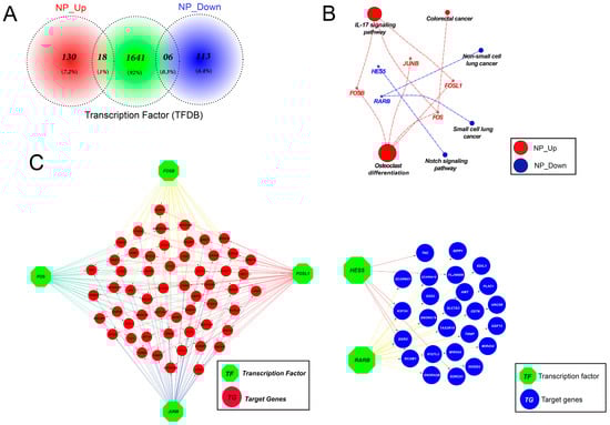 Graphene oxide altered transcription factor (TF) expression, resulting in changes to downstream gene expression. (A) Venn diagram showing TFs among the DEGs. Eighteen out of 148 upregulated genes and six out of 119 downregulated genes were identified as TFs. (B) KEGG analysis with TFs differentially expressed following graphene oxide exposure. Red color: Upregulated genes; blue color: Downregulated genes. (C) Networks showing differentially expressed target genes downstream of the TFs identified in (A).