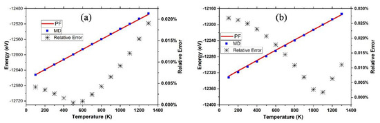 As shown in Figure 6, the internal energy () derived from the PF was in excellent agreement with that () obtained by the MD simulations with a relative standard deviation of 0.008%, which is too small to be shown in Figure 6. For temperatures lower than 500 K, the relative error () was only 0.001% and gradually increased up to 0.021% for 1300 K. It may be expected that the relative error would get smaller if the effective length of the edge atoms was calculated, instead of replacing with the one of the center atom, to calculate Q by Equation (11).