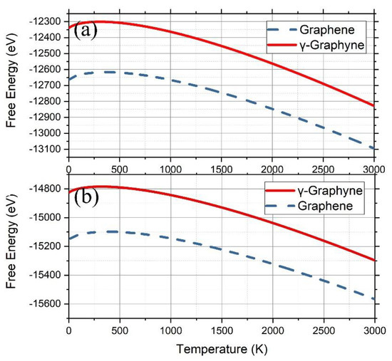 Applying the free energy of graphene and γ-graphyne on Cu (111) was calculated (Figure 4a), showing that the free energy of graphene is always smaller than that of γ-graphyne in the temperature range from 100 K to 3000 K. The difference at 100 K, 321 eV, decreased gradually down to 267 eV with the temperature increasing up to 3000 K, indicating that graphene should be more easily grown than γ-graphyne on a Cu (111) surface via depositing C atoms. We also calculated the free energy on a Ni (111) surface (Figure 4b) using the same method and found that graphene still owned smaller free energy than γ-graphyne, although the difference at 100 K, 318 eV, became gradually small with the temperature. These results are consistent with previous experimental observations [50,51].