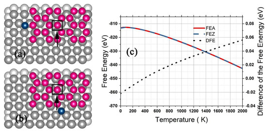 For calculations of FEZ and FEA, the system was optimized firstly with the bottom layer of the Ag substrate fixed, and then, the adhered Si atom (and one of the Si atoms denoted by a square in Figure 7a,b in the center of the silicene) was moved along the X, Y, and Z direction step by step with an interval of 0.1 Å to produce for calculating the effective length , , and (or the , , and ) via Equation (9), and finally, the configurational integral was obtained by: