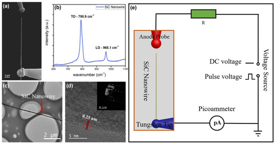 Wide-bandgap semiconductor materials are one of the leading contenders for powered electronic devices, light-emitting diodes, transducers, and high-electron-mobility transistors. Silicon carbide (SiC) is known as a significant wide-bandgap semiconductor material owing to its high thermal conductivity, low thermal expansion coefficient, and good chemical stability. It is also considered as one of the promising materials potentially used in various microelectromechanical systems (MEMS) sensors owing to its large Young’s modulus [1,2,3,4,5,6]. Compared to the bulk counterparts, one-dimensional (1D) SiC nanomaterials possess even more unique morphology features and outstanding electrical–mechanical properties because of their low dimensionality, quantum confinement, and shape effect, which also make them very promising for use in electron emitters [7,8,9,10,11,12], sensitive sensors [13,14,15,16,17,18], and so on. Compared with other 1D nanostructure emitters [19,20], SiC nanowires have low turn-on fields, low threshold fields, and good current emission stabilities for its high field enhancement factor, low electron affinity, excellent mechanical properties, and high chemical stability [21,22,23].