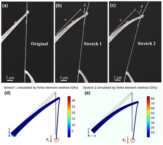 Under the action of the drawing force of SiC nanowire, the vimineous tip from the tungsten needle began to bend, and the bending degree increases with an increase in drawing forces. To explore the relationship between the bending distance d and the drawing force F, the finite element method was used to simulate the drawing force. As mentioned by the literature, the Young’s modulus of tungsten nanowires is 332 GPa [31], and the Young’s modulus of SiC nanowires is 550 GPa [32]. A boundary load was used to apply drawing force at the end of SiC nanowire, marked by the red dashed circle, with direction along the negative z-axis, as shown in Figure 2d,e. In the simulation, the bending distance d increased with the increase of the applied drawing force F. As indicated in Figure 2b,c, the bending distance d1 was 1.4 μm in the state of stretch 1, and the bending distance d2 was 2.3 μm in the state of stretch 2. According to the simulation results shown in Figure 2d,e, the corresponding drawing forces F1 and F2 were calculated to be about 15 μN and 26 μN, respectively.