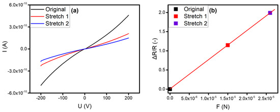 As indicated in Figure 3a, I-U curves on the above three states were carried out for exhibiting the obvious piezoresistive effect of SiC nanowire, and the resistance of the SiC nanowire increased with the increase of drawing forces. As the W-SiC contact is Schottky, all I-U curves in Figure 3a exhibit a similar nonlinearity. To calculate the resistances of SiC nanowire, the equation R = ∆V/∆I was used, where ∆V is the voltage variations between two measured points in the linear sections under a positive bias (>150 V) of the I-U curves in Figure 3a, and ∆I is the corresponding current change, respectively. Thus, the relative resistance change (ΔR/R0) was calculated using I-U curves, as shown in Figure 3a. In addition, the relationship between the relative resistance change and the applied drawing force (F1, F2) was also plotted, as shown in Figure 3b. The relative resistance changes linearly increased with the drawing force, that is, the resistance of SiC nanowire changes significantly when a large tensile force is applied.