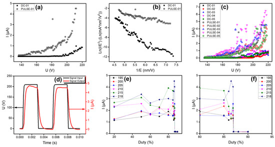 Table 1 and Figure 4c present a comparison of field emission properties of 5 typical samples in DC and pulsed driving modes. The results indicate that the pulsed driving mode has a much higher emission current than the DC driving mode for the SiC nanowire, both in the region of low voltage and high voltage. It is worth mentioning that the pulsed driving mode in the region of high emission current density can reduce heat effect to avoid the breakdown of emitters [35]. However, as reported by S. L. Chen, et al. [36], heat effect is conducive to the field emission ascribed to the increase of the electron–hole pairs. This is contrary to our results. To understand this opinion, the relationship between emission current and duty ratio in pulsed driving mode was studied, the electron emission of the SiC nanowire was carried out at 195 V, 200 V, 205 V, 210 V, 215 V, and 218 V. Figure 4d shows a typical pulse waveform with 200 Hz and 50% duty ratio. As shown in Figure 4e,f, the emission current changed briefly in the region with duty ratio less than 85%, and the emission current decreases rapidly with the increase in duty ratio when the duty ratio is more than about 85%. The emission current of pulsed driving mode was closer to the DC driving mode when duty ratio was close to 87%. Thus, the above results demonstrate that the electron emission properties of the SiC nanowire under pulsed driving mode were affected by electronic transport properties besides the field enhancement factor β and work function ϕ.
