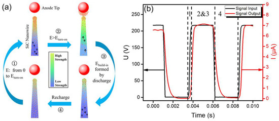 To illustrate the above opinion, a pumping-like electron recharge process was used to explain the electron emission behavior of SiC nanowire in the pulsed driving mode, whose corresponding model is shown in Figure 5a.