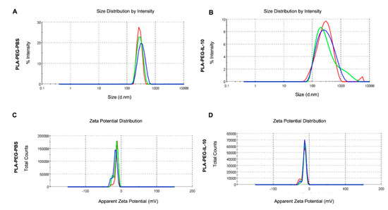 Figure 2. Zeta-sizing and zeta-potential measurements of encapsulated Interleukin-10 (IL-10). Nanoparticles (Poly-(lactic acid)-Polyethylene glycol (PLA-PEG)-IL-10 and PLA-PEG-Phosphate buffered saline (PBS)) were diluted in sterile deionized water and scanned in cuvettes using Malvern Nano-ZS for zeta-sizing (A,B) and zeta-potential (C,D). Triplicate readings were obtained for each nanoparticle sample.