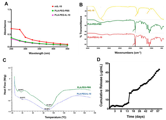 Figure 3. Physiostructural characterization and release of nanoparticles. Nanoparticles and IL-10 were dissolved in DNAse-RNAse free water and analyzed by spectroscopy (A). FT-IR spectra were employed to show the various functional groups and differences in the absorption spectra for nanoparticles. The FT-IR spectrum was recorded with 64 scans/sample ranging from 4000 to 1000 cm−1 and a resolution of 4 cm−1 at ambient temperature (B). Thermal stability of IL-10 encapsulated within PLA-PEG nanoparticles was determined by placing nanoparticles in an aluminum pan, sealing it, and then heating it at the rate of 20 °C per min from 30 to 120 °C under nitrogen, before cooling it from 120 to 30 °C at the same rate, using a differential scanning calorimeter. Shown are peaks for PLA-PEG-PBS (green) and PLA-PEG-IL-10 (blue), respectively (C). The in vitro release of IL-10 from PLA-PEG nanoparticles was determined by placing nanoparticles in sterile PBS. At each time-point, supernatants were collected and the IL-10 content was measured spectrophotometrically. Shown is the average cumulative release of IL-10 over a period of 60 days, and the experiment was performed three times (D). DNA = deoxyribonucleic acid, IL-10 = Interleukin-10, FT-IR = Fourier Transform-Infrared, PBS = Phosphate-buffered saline, PLA-PEG = Poly (lactic acid)-Poly (ethylene glycol), RNA = ribonucleic acid, UV = Ultra-Violet.