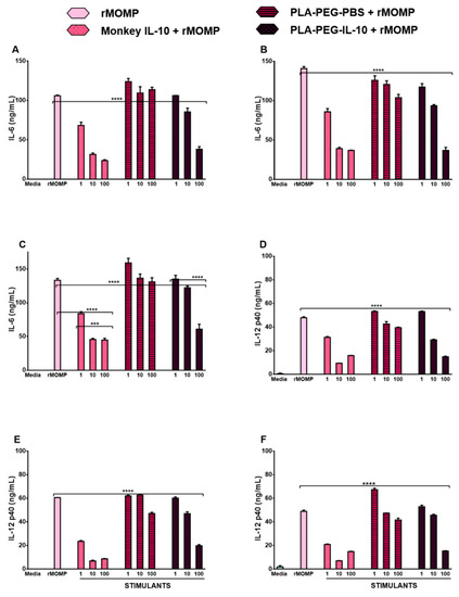 The highly immunogenic MOMP of Chlamydia contributes to its inflammation by stimulating macrophages to secrete pro-inflammatory cytokines that play a pivotal role in the pathogenesis of the disease [25]. The successful encapsulation, physio-structural, and in vitro release of encapsulated-IL-10 warranted testing its functional anti-inflammatory effects in modulating inflammatory cytokines triggered in mouse J774, in response to rMOMP stimulation. Accordingly, we performed dose-response and time-kinetics studies to assess the cytokine release profile of macrophages after their exposure to rMOMP in the presence and absence of PLA-PEG-IL-10 (1–100 ng/mL) as compared to bare monkey IL-10 (1–100 ng/mL). Herein, we used IL-6 and IL-12 p40 as markers of inflammation to determine the anti-inflammatory effect of PLA-PEG-IL-10 on its secretion from macrophages stimulated with rMOMP for 24–72 h. Stimulation of macrophages with rMOMP resulted in dose-dependent increases in the production of IL-6 (Figure 4A–C) and IL-12p40 (Figure 4D–F) that were further enhanced with each time-point. Of the upmost importance to our study was that our data shows that all concentrations of monkey IL-10 alone (1–100 ng/mL) and encapsulated-IL-10 (1–100 ng/mL) reduced the levels of IL-6 and IL-12 p40 in mouse J774 macrophages post 24–72 h treatment as compared to rMOMP (positive control) and PLA-PEG-PBS concentrations (negative control) (Figure 4A–F). Interestingly, we also observed that high concentrations of PLA-PEG-PBS caused the minimal inhibition of IL-6 and IL-12p40, suggesting that PLA-PEG does possess some immune potentiating abilities that enhance the therapeutic effect of IL-10. Furthermore, the inhibition effect of IL-10 was maintained over time, where the most effective inhibition was observed at 72 h, confirming the slow, accumulated release of encapsulated IL-10 during interaction of the nanoparticles with macrophages for the enhanced suppression of pro-inflammatory responses (Figure 4C,F). Overall, this data provides compelling evidence that encapsulated IL-10 is functional and maintains its anti-inflammatory properties in eukaryotic cells.