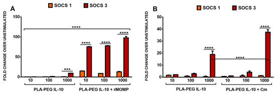 Figure 5. Differential transcriptional expression of SOCS1 and SOCS3 induced by stimulated macrophages. Mouse J774 macrophages (3 × 106 cells/mL) were co-stimulated with various concentrations of PLA-PEG-IL-10 or PLA-PEG-PBS with rMOMP (10 µg/mL) or Live Cm (MOI 2). RNA was collected from cultures at 24 h and analyzed by RT-PCR to determine SOCS1 and SOCS3 mRNA transcript levels. For RT-PCR and quantitative real-time PCR, all values were normalized with respect to GAPDH mRNA levels. Results are presented as the fold increase over the control (i.e., the level in unstimulated cells). The results shown are the means ± standard deviations of three separate experiments (A-B). Data were analyzed by two-way ANOVA, followed by Tukey’s post-hoc test using GraphPad Prism 6 software. *** p < 0.001, and **** p < 0.0001. ANOVA = analysis of variance, GAPDH = glyceraldehyde 3-phosphate dehydrogenase, IL-10 = interleukin-10, mRNA = messenger ribonucleic acid, rMOMP = recombinant major outer membrane protein, RT-PCR = real time polymerase chain reaction, SOCS = suppressor of cytokine signaling.