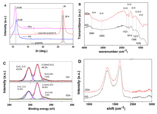 The characteristics of GO nanomaterials are depicted in Figure 1. The XRD results in Figure 1A indicated improved oxidation degree and lower stacked sheets number for GOx than the GO nanomaterial (about five with respect to 10 stacked sheets). On the other hand, the improved oxidation degree in GOx counterparts is confirmed by the more intense FTIR peaks and slight shifts of the carbonyl C=O stretching vibration, O–H and carboxylic C=O vibration at 1721, 1217 and 1388 cm−1, respectively. The XPS results indicated an increased oxygen content upon using an expanded graphite which is in agreement with XRD and FTIR results. A difference in oxygen group contributions is observed, where the use of expanded graphite results in higher C–OH/C–O–C contribution. Such results could be explained by an enhanced penetration of the oxidant into the inter-layer space between the expanded graphite sheets, thus leading to a higher contribution from C–OH/C–O–C on the basal graphene plane. On the other hand, the Raman spectroscopy confirmed varying defects introduced in the graphene framework by expanding the graphite. It has been suggested that despite the use of the ID/IG ratio for evaluating the disorder degree, no distinction can be made between holes and sp3 defects [29,30]