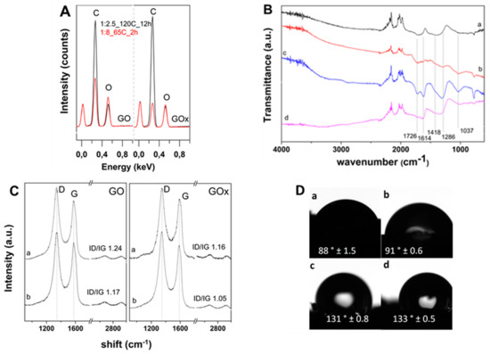 (A) EDS spectra of aerogels from GO and GOx dispersions; (B) FTIR spectra of aerogels from GO and GOx at 1:8_65 °C_4 h (a and b), GOx at 1:2.5_4 h at 65 °C and 120 °C (c and d); (C) Raman spectra of aerogels from GO and GOx at 1:8_65 °C_2 h (a) and 1:2.5_120 °C_12 h (b); (D) Average contact angle of GO (left) and GOx (right) aerogels obtained in the conditions: 1:8_65 °C_4 h (a and b), and 1:2.5_120 °C_12 h.