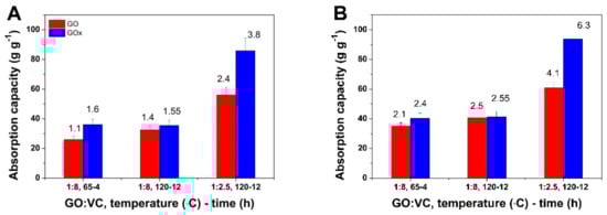 The applicability of obtained aerogels for oil/water separation was tested as a function of synthesis conditions and type of GO nanomaterial. As it is observed in Figure 5A, the oil uptake increases with temperature for a given GO:VC w/w ratio. Such an increase is more evident for GO aerogels than the GOx ones. The aerogels obtained by predominant solvothermal reduction appear to exhibit better oil uptake than predominant chemical reduction, the oil capacity reaching 56.06 and 85.86 g g−1 for GO and GOx aerogel, respectively. The organic solvent separation results depicted in Figure 5B follow the same trend but reach higher values in all cases. The GOx counterparts exhibit higher performance than the GO ones. The organic solvent uptake capacity is higher for the aerogels consolidated by predominant thermal reduction, reaching more than two-fold the predominant chemical one. The demonstrative recording of the oil uptake by the aerogel obtained from GOx nanomaterial in conditions of predominant solvothermal reduction can be found in the supplementary video material. It can be observed that the aerogel presents itself as a light 3D monolith with a high absorption rate.