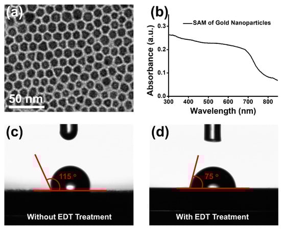 (a) TEM image of SAM of gold nanoparticles. (b) UV-Vis absorption spectrum of SAM of gold nanoparticles. Contact angles of SAM of gold nanoparticles before (c) and after (d) EDT treatment.