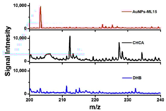 To investigate the performance of AuNPs-ML sample substrate, merchant matrixes included CHCA and DHB were employed to measure glucose (10−3 M) in SALDI-MS. As shown in Figure 5, the interference coming from the matrix of CHCA was extremely strong for glucose detection in SALSI-MS. With the additive of merchant assisted matrix of DHB, the weak intensity of glucose signal and the low signal-to-noise ratio were obtained in comparison with the sample substrate of AuNPs-ML15. Overall, the sample substrate of AuNPs-ML15 exhibited the highest intensity of glucose signal, the lowest background noise and the excellent S/N ratio compared to that of merchant matrixes of CHCA and DHB. The results demonstrated that AuNPs-ML15 has revealed the great potential for the use as a sample substrate for the detections of small molecules without additional matrix in SALDI-MS.