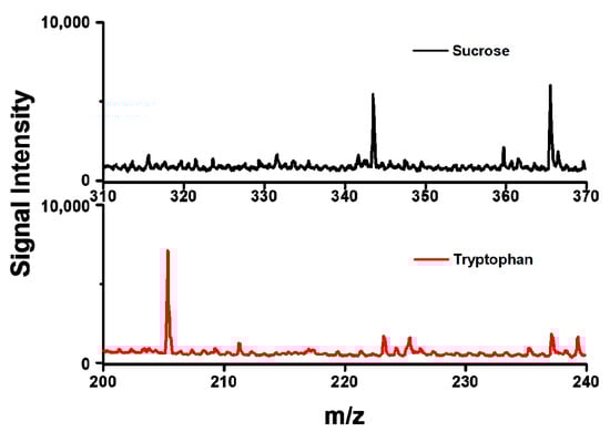 To further examine the performance of sample substrate of AuNPs-ML15, small molecules of sucrose (10−3 M) and tryptophan (10−3 M) were applied as analytes in SALDI-MS measurements. As shown in Figure 6, the sucrose was detected as the [sucrose+H]+ and [sucrose+Na]+ ions and the tryptophan was measured as the [tryptophan+H]+ ion. Both of the mass spectra of sucrose and tryptophan exhibited strong signal intensities and low background signals. The results indicated that very few fragment ions of the analytes can be detected with the use of sample substrate of AuNPs-ML15 in SALDI-MS. Furthermore, the sample substrate of AuNPs-ML15 showed no significant interference for the measurements of sucrose and tryptophan in SALDI-MS. Overall, AuNPs-ML15 was demonstrated as the sample substrate to obtain strong signal intensity and low background signal for small molecules in SALDI-MS.