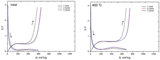 Figure 11 shows the charging curves of the first three cycles of the researched specimens before and after annealing [43,44]. The cycling was conducted in the galvanic mode in the voltage range (U) from 10 mV to 3 V.