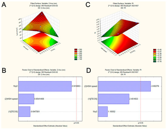 Graphical representation of the interaction between the independent variables on SiNP properties (factorial design experiment set in Table 1). Surface response plots of the effect of TEOS concentration and HSH speed on Z-Ave (A) and PI (C) of SiNP. Pareto chart of the effect of TEOS concentration and HSH speed on Z-Ave (B) and PI (D) of SiNP. Vertical lines in Pareto chart indicate the critical effect at 95% confidence level.