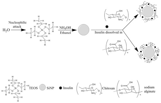 From the reported data, an optimal SiNP formulation may be produced with 0.43 mol/L of TEOS and HSH of 5000 rpm. Such conditions generated the synthesis of optimized SiNP with a Z-Ave of 256.6 ± 20.3 nm and a PI of 0.218 ± 0.074. Therefore, F1 was selected as the best formulation to develop hybrid nanoparticles by coating SiNP with chitosan or sodium alginate for insulin association. In this case, the presence of the residual silanol groups in the SiNP surface was used as reactive site to provide efficient surface modification, as well as insulin association (Figure 2).