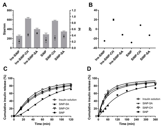 The influence of coating on the properties of SiNP (Z-Ave, PI and ZP) before and after insulin association is shown in Figure 3A,B. Coating SiNP with both polysaccharides led to an increase of Z-Ave and PI. SiNP-CH showed severe particle aggregation exhibiting a Z-Ave around 600 nm and PI around 0.4, while the adsorption of sodium alginate onto SiNP surface led an increment in the particle size of ~390 nm and PI of 0.5 (Figure 3A). This behavior is confirmed by other studies which particle’s agglomeration was observed after coating of nanoparticles with polysaccharides due to the presence of high density and concentration of polymer chains onto nanoparticle surface [38]. As estimated by DLS measurements, compared with coated SiNP, the insulin association led to a slight change on the mean size and size distribution of nanoparticles as depicted in Figure 3A.